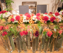 テーブルコーディネートひとつで会場の雰囲気が変わります。テーマが「レインボー」の際にはテーブル毎にお花の色・ナフキンの色を7色に会場全体がとても華やかな空間になりました。