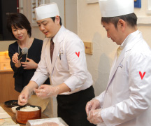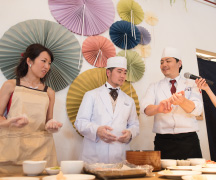 ブリッジでは、他では体験することのできない料理長自ら参加する料理パフォーマンスが人気です。みなさまの前で新郎新婦様も一緒にお寿司を握ります。なかなかすることができない体験と、そしてお世話になっている方々へ直接手渡しで、感謝の気持ちを込めてお渡しするので人気の演出になっています。