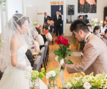 ダーズンローズセレモニーで新郎様から新婦様へバラの花束をお渡ししたり・・・