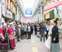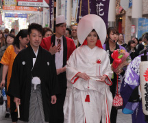 “豊後花嫁道中”ガレリア竹町〜セントポルタ中央町を花嫁姿で練り歩きます。商店街の方々をはじめ、街行く方からもたくさんの祝福の言葉をいただきます。